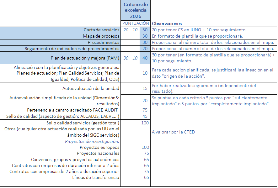 La Universidad de Zaragoza, para reconocer este esfuerzo que han realizado las unidades en su día a día en el que prima la calidad y la mejora ha establecido el siguiente baremo de puntuaciones para el 2026:
