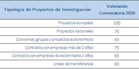 El PTGAS adscrito a proyectos de investigación recibirá como VDO en 2026 la asignada a su proyecto que, según su tipología, se han determinado de la siguiente forma: